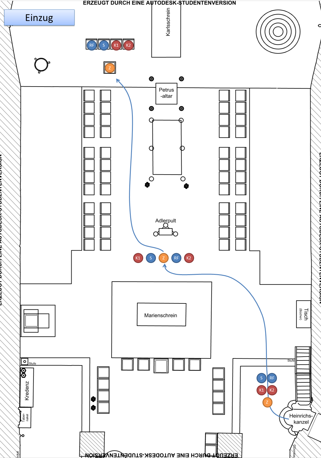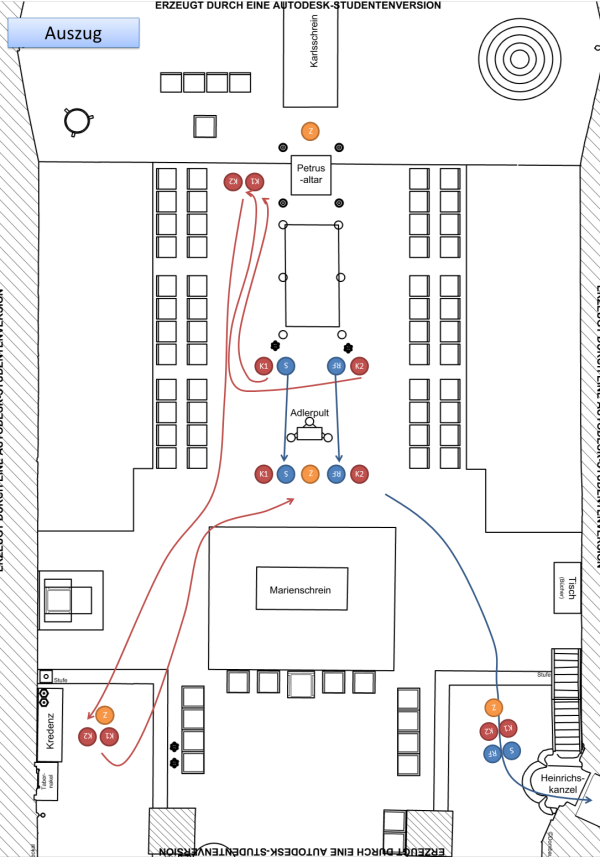Kleiner Einzug ohne Weihrauch und Kerzen, vier Ministranten plus Offiziant; Aufstellung zwischen Marienschrein und Adlerpult mit Blickrichtung Adlerpult: zwei Ministranten rechts, zwei links, Offiziant in der Mitte; Reverenz; gemeinsamer Gang zu den Sitzen, Ministranten gehen vor.