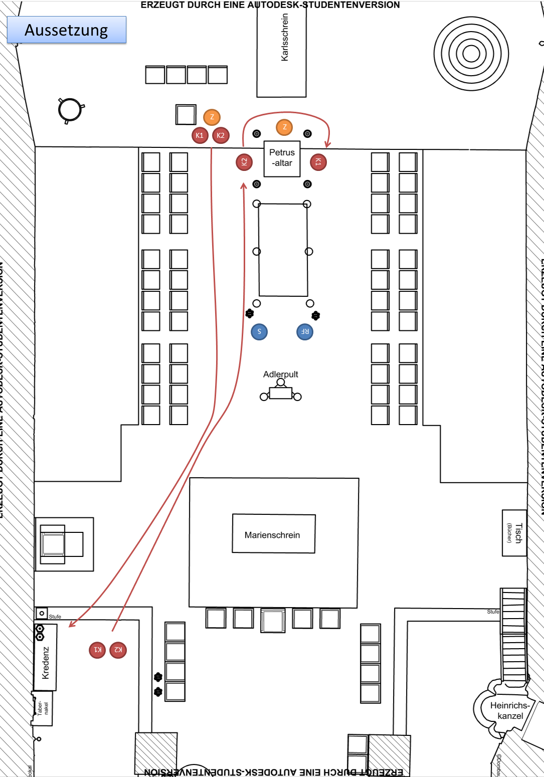 Vor Beginn werden die Leuchter mit den brennenden Kerzen auf die Kredenz am seitlichen Ambo gestellt. Schiffchen und Weihrauchfass mit glühenden Kohlen werden zum an den Ministrantensitzen bereitgestellten Ständer gebracht. Es sollte darauf geachtet werden, dass die Klingeln und das Funkmikro vor dem Ottograb liegen, dass für Offiziant und Ministranten Liedhefte bereitliegen und dass die Kordeln zwischen Ottograb und Petrusaltar entfernt sind.