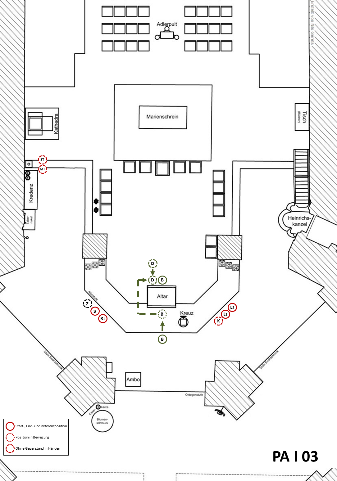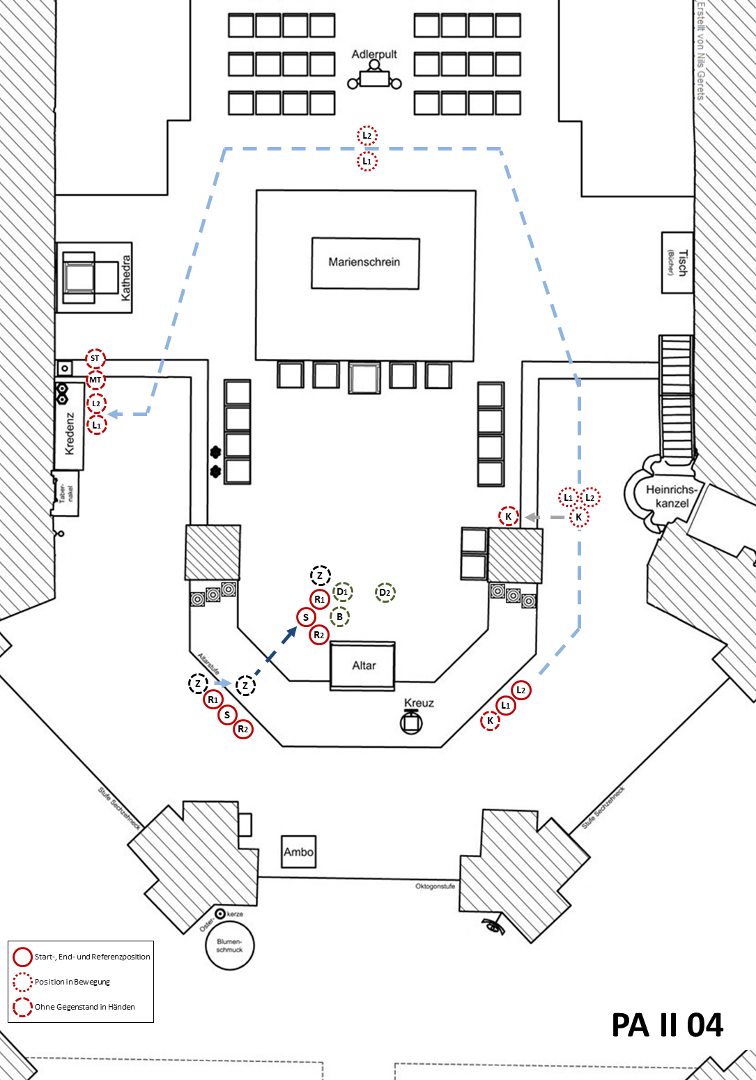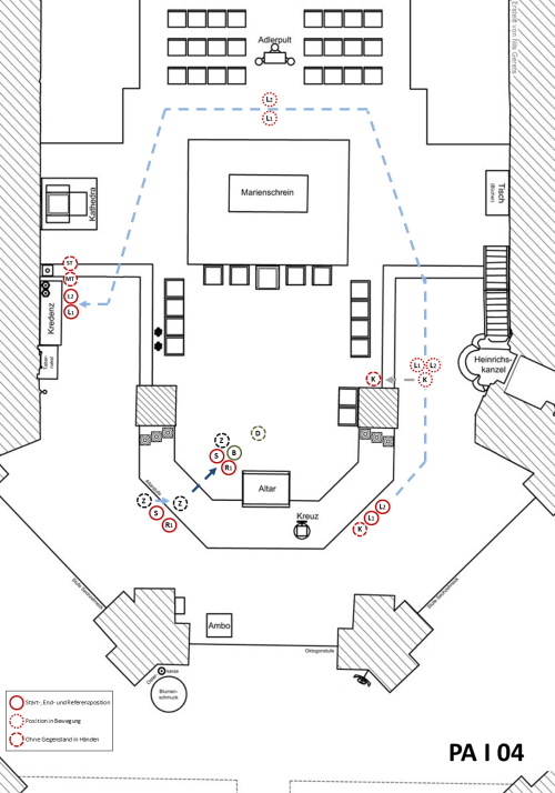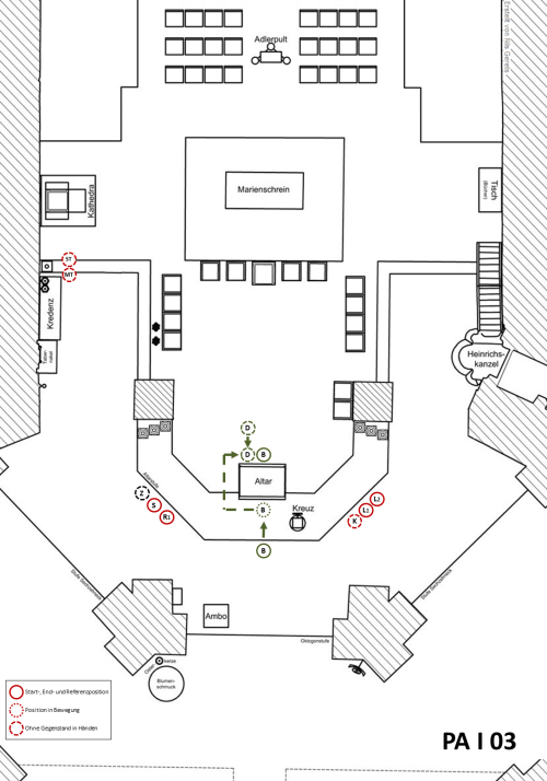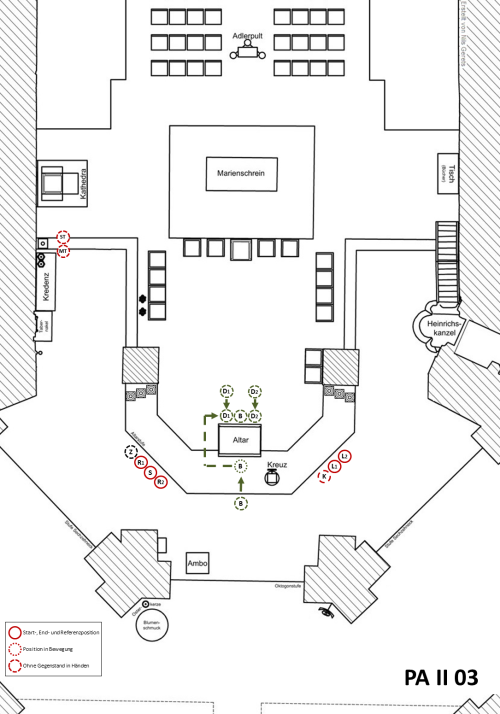 Nach dem Altarkuss des Hauptzelebranten gehen die Leuchterträger ohne Stehenbleiben bzw. Verneigung (Reverenz) nebeneinander hinter dem Marienschrein entlang auf die Tabernakelseite, stellen die Leuchter auf der Kredenz ab und gehen zu den Sitzplätzen vor der Kredenz.