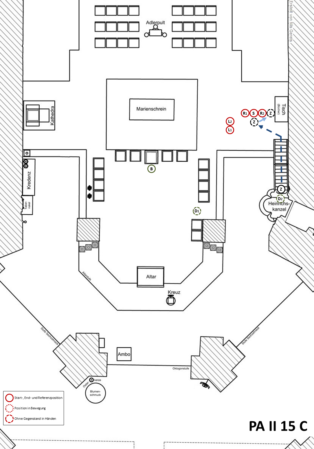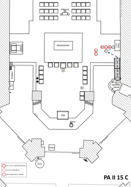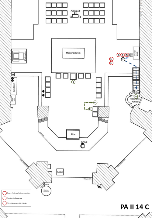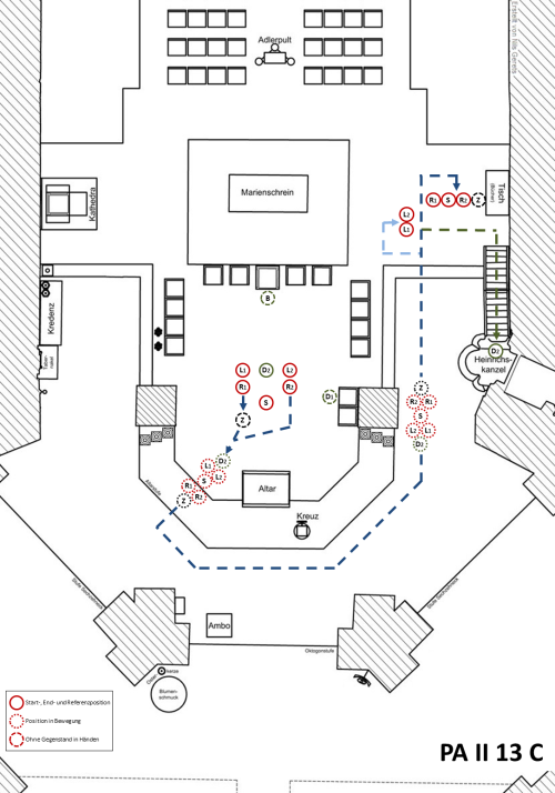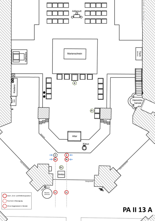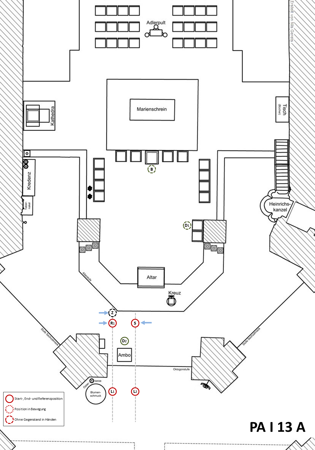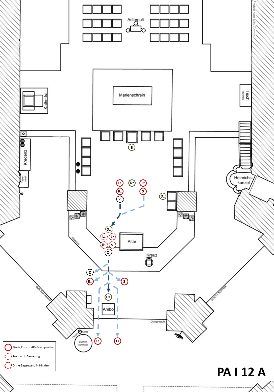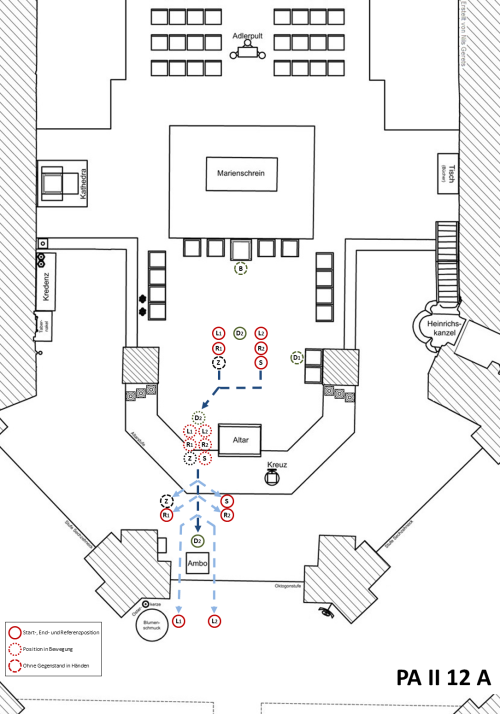 | Rauchfassträger und Schiffchenträger folgen paarweise dem Zeremoniar und gehen zusammen rechterhand am Altar vorbei über die Schräge zum Ambo. Beide stellen sich in etwa mittig zwischen Oktogonstufe und Altarstufe gegenüber auf (ad invicem). Sie lassen dabei ausreichend Abstand zueinander, so dass die Leuchterträger zwischen ihnen hindurchtreten können. Stehen alle Ministranten auf ihrer Position, treten alle Ministranten – sofern notwendig – einen Schritt aufeinander zu, so dass der Abstand in etwa der Breite des Ambos entspricht. Die genaue Aufstellung ist der folgenden Skizze zu entnehmen. | Die beiden Rauchfassträger folgen Zeremoniar und Schiffchenträger paarweise und gehen zusammen rechterhand am Altar vorbei über die Schräge zum Ambo. Beide Rauchfassträger treten durch die von Zeremoniar und Schiffchenträger gebildete Gasse und stellen sich dann neben ihnen gegenüber auf (ad invicem). Auch sie lassen dabei ausreichend Abstand zueinander, so dass Leuchterträger zwischen ihnen hindurchtreten können. Stehen alle Ministranten auf ihrer Position, tritt der Zeremoniar einen Schritt nach vorn, so dass er auf einer Linie mit den anderen Ministranten steht. Die genaue Aufstellung ist der folgenden Skizze zu entnehmen. | Der Schiffchenträger tritt in die Mitte des Spaliers und lässt die beiden Rauchfassträger an sich vorbeiziehen. Die beiden Rauchfassträger folgen dem Zeremoniar paarweise, ihnen schließt sich der Schiffchenträger an, dann folgen wieder paarweise die Leuchterträger. Die liturgische Gruppe zieht zunächst über die linke Schräge in Richtung Ambo, biegt dann aber links ab und geht vor dem Altar in Richtung Chorhalle zur Heinrichskanzel. Etwa auf Höhe des Marienschreins schreitet der Zeremoniar in einer ausladenden Kurve im Uhrzeigersinn und kommt vor der Kredenz an der Heinrichskanzel zum Stehen. Es folgt ihm die gesamte Weihrauchgruppe. Bei der Schwenkbewegung reiht sich der Schiffchenträger zwischen den Rauchfassträger ein. Gemeinsam bilden Zeremoniar und Weihrauchgruppe eine Linie, die im rechten Winkel zur Chorhallenwand ist. Die genaue Ordnung ist der folgenden Skizze zu entnehmen. Der Rauchfassträger (mit Inzensfass) gibt das Rauchfass an den Zeremoniar. Nach erfolgter Inzens bringt der Zeremoniar das Rauchfass dem Rauchfassträger zurück. |