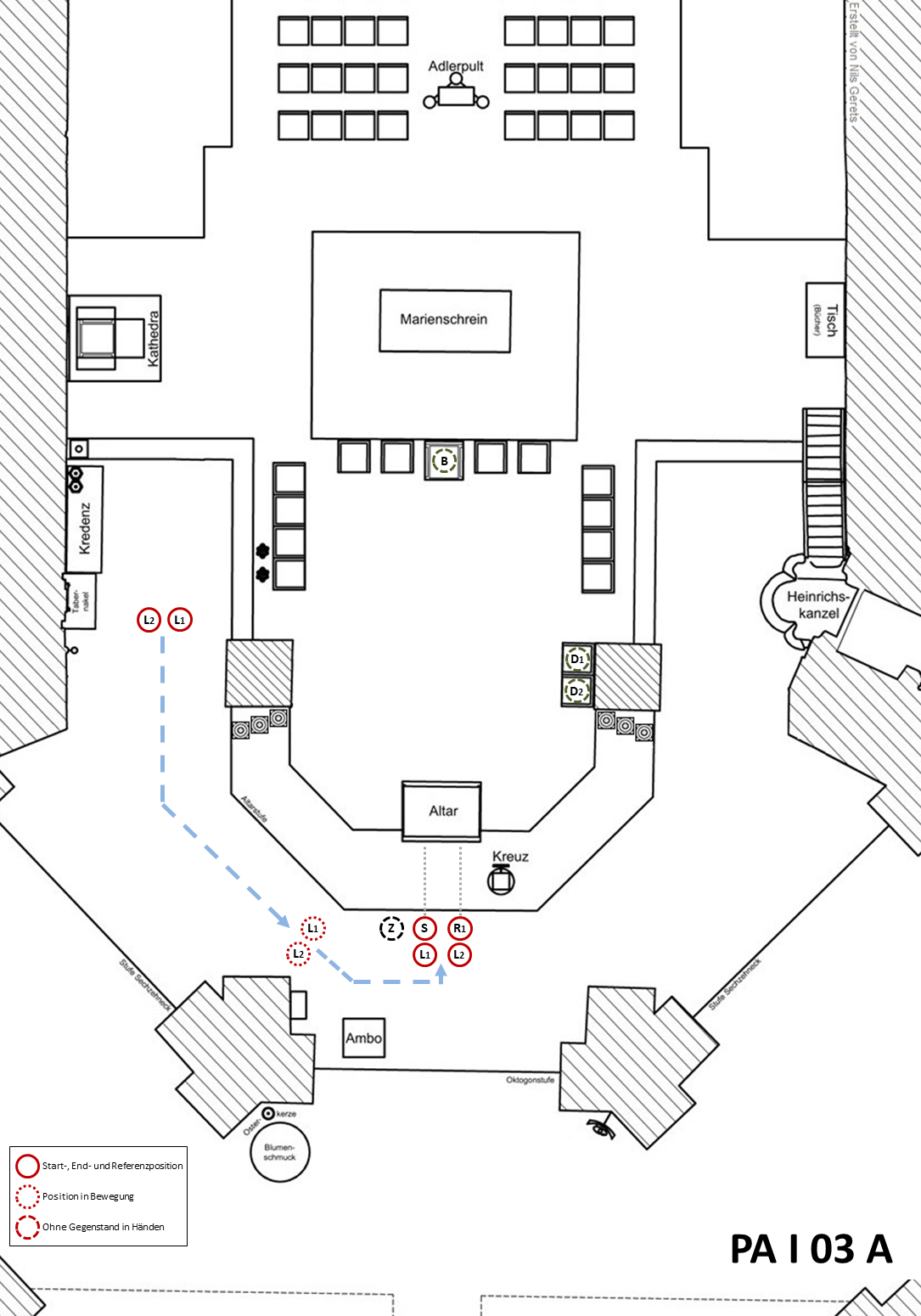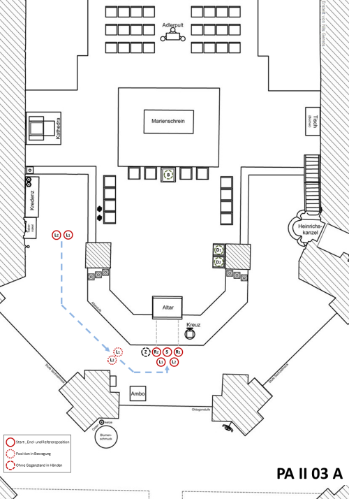 Die Ministranten stehen in zwei Reihen vor dem Altar. In der ersten Reihe stehen der Zeremoniar und die Weihrauchgruppe, in der zweiten Reihe stehen die beiden Leuchterträger. Die Weihrauchgruppe macht gleichzeitig mit dem Zeremoniar eine Verneigung (Reverenz) vor dem Altar; die Leuchterträger machen hingegen keine Verneigung. Die genaue Ordnung zur Aufstellung ist der folgenden Skizze zu entnehmen: