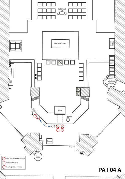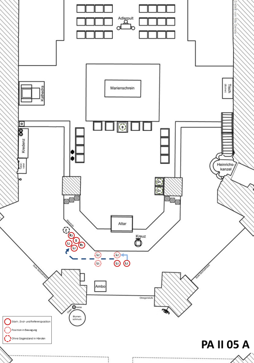 Nach der gemeinsamen Verneigung (Referenz) dreht sich die Weihrauchgruppe gemeinsam mit dem Zeremoniar um 90 Grad nach links und schreitet hintereinander (im Gänsemarsch) zur linken Schräge. Nachdem sich die Weihrauchgruppe wieder um 90 Grad nach rechts gedreht hat, zieht sie hinter dem Zeremoniar zum Einlegen. Beim Einsatz von zwei Rauchfässern folgen diese unmittelbar dem Zeremoniar, während der Schiffchenträger hinter ihnen geht. Beim Einsatz von nur einem Rauchfass gehen Rauchfass- und Schiffchenträger gemeinsam direkt hinter dem Zeremoniar. Der Zeremoniar geht zunächst frontal auf den Hauptzelebranten zu, bevor er nach links ausweicht (Tabernakelseite) und dort das Einlegen abwartet. Die Weihrauchgruppe tritt vor den Hauptzelebranten, wobei der Schiffchenträger mittig steht, die Rauchfassträger links und rechts (bzw. der Rauchfassträger rechts). Nach einer gemeinsamen Verneigung (Referenz) öffnen die Rauchfassträger die Rauchfässer und halten sie dem Hauptzelebranten zum Einlegen hin. Dabei ist das Schiffchen direkt neben das Fass zu halten, so dass beim Einlegen mit dem Löffelchen eine möglichst geringe Distanz überwunden werden muss.